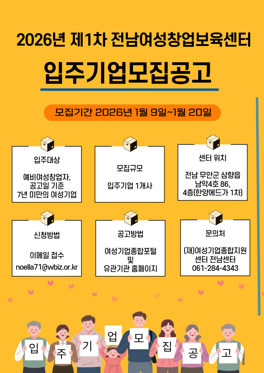 (재)여성기업종합지원센터 전남센터에서는 창의적이고 우수한 예비 및 여성창업자 지원을 위하여 아래와 같이 입주기업을 모집합니다. (~2026.1.20.)