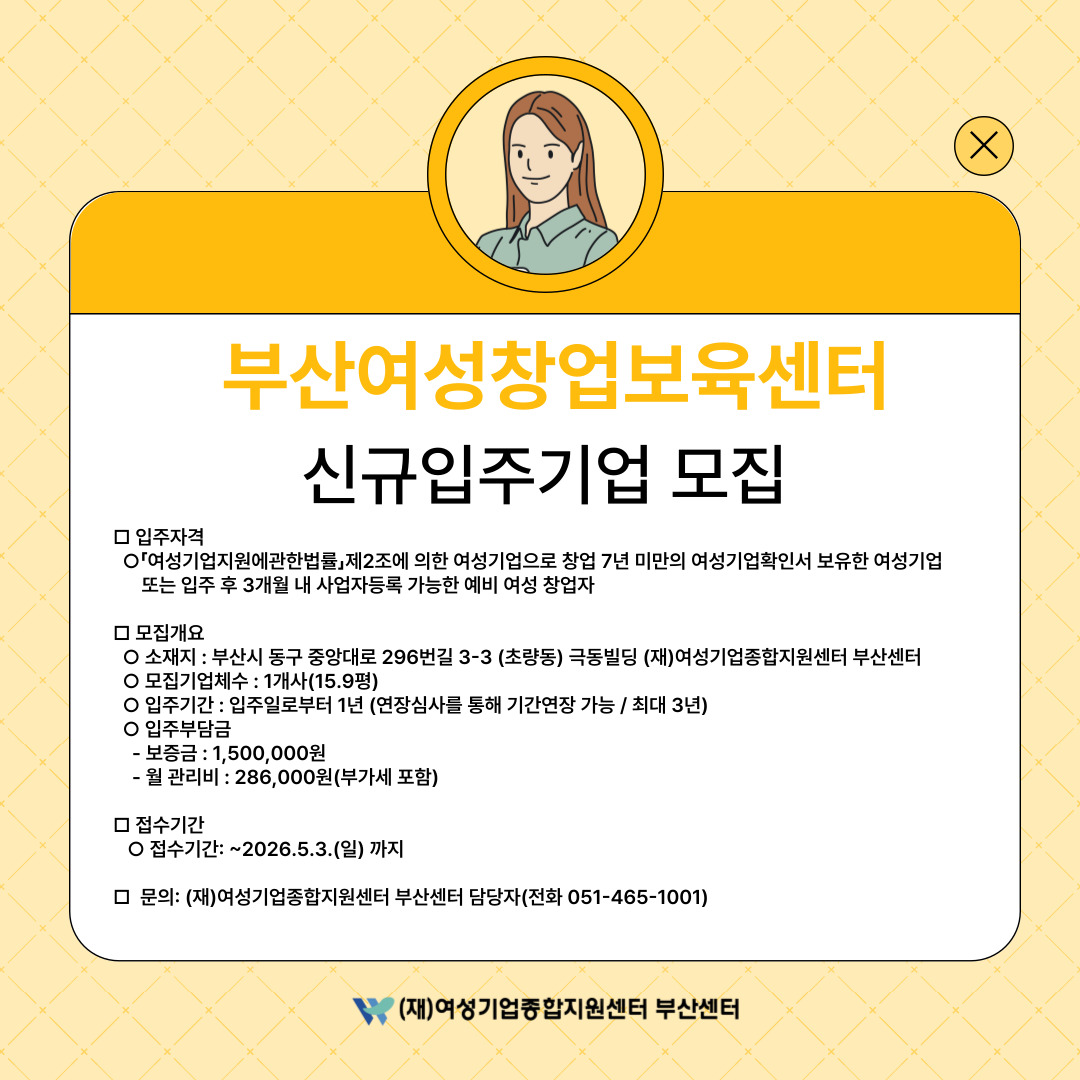 (재)여성기업종합지원센터 부산센터 2026년 제1차 신규입주모집 연장공고(~5.3)